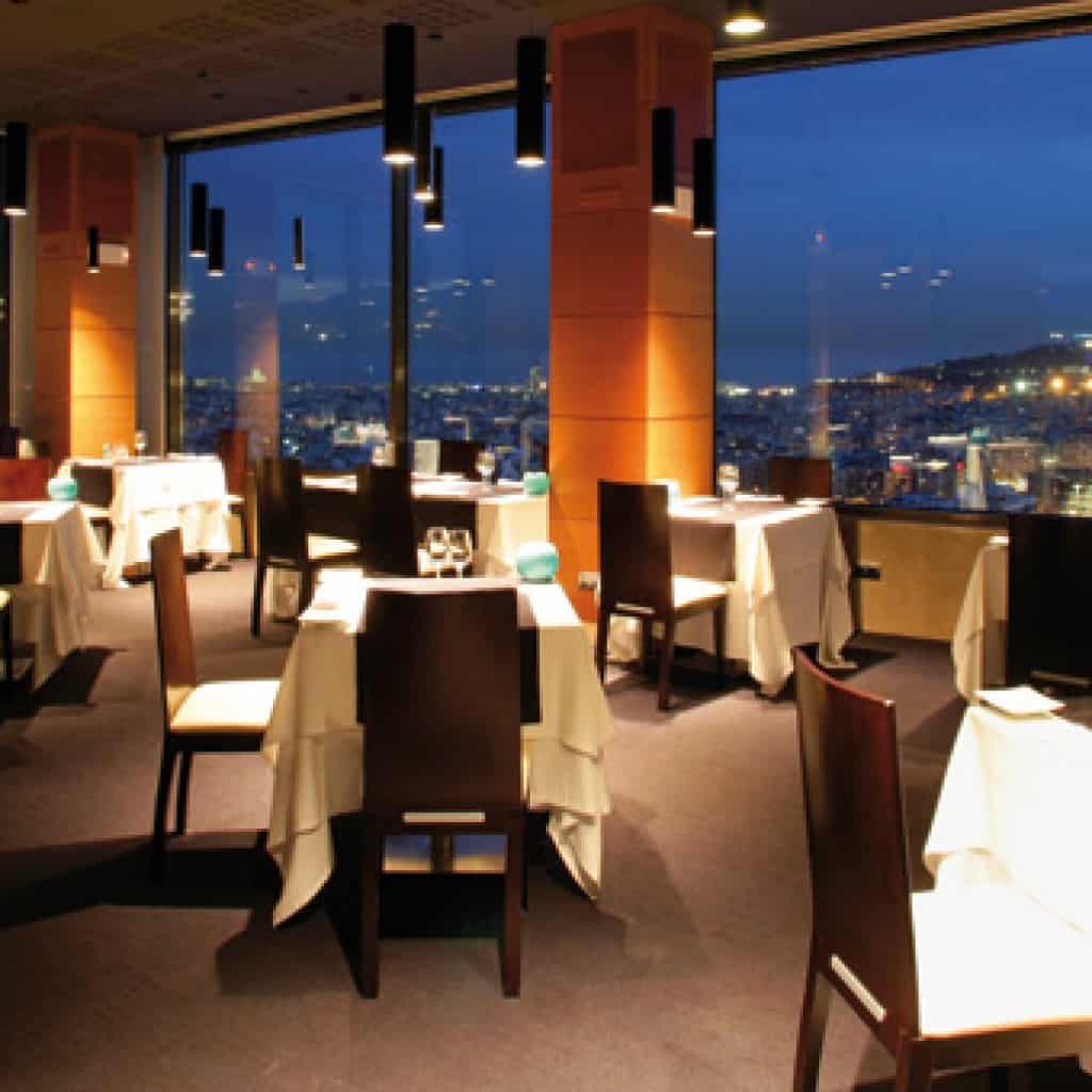 A sophisticated dining establishment in Spokane with large windows showcasing the city skyline, stylish decor, and a warm atmosphere ideal for special occasions and romantic dinners.